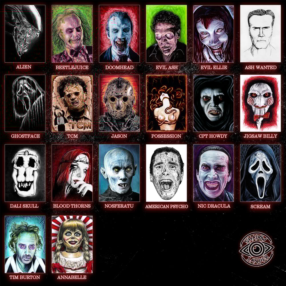 Alien, Xenomoprh, Beetlejuice, Doomhead 31, Evil Dead, Ash, Evil Dead Rise, Jason, Friday 13th, Ghostface, Scream, Texas Chainsaw, Leatherface, Kurt Barlow, Nosferatu, Vampire, American Psycho, Bateman, Venom, Joker, Saw, Jigsaw, Skull, Exorcist, Demon, Possession, Medusa, annabelle, conjuring